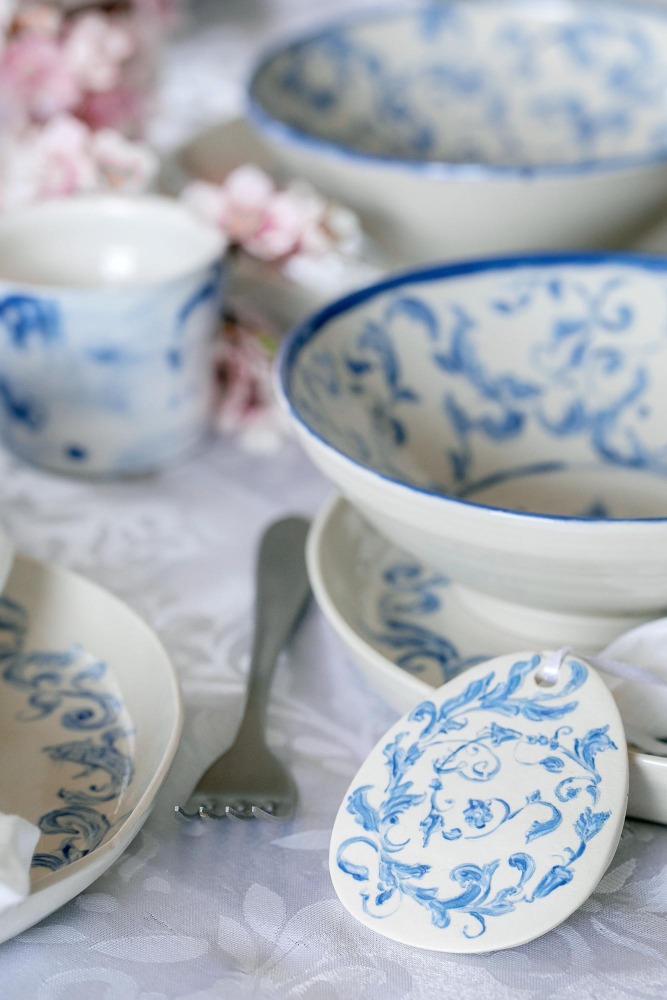 Je travaille en dessinant moi-même mes modèles sur un support en porcelaine blanche (pièce unique) et en apposant la couleur la plus fine possible plusieurs fois (température entre 890 à 1100 degrés à chaque cuisson) afin d’obtenir une pièce qui ne craindra pas le lave-vaisselle, le micro onde, le four électrique, le couteau et le congélateur.