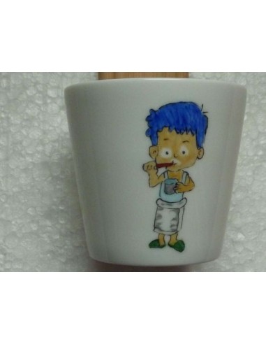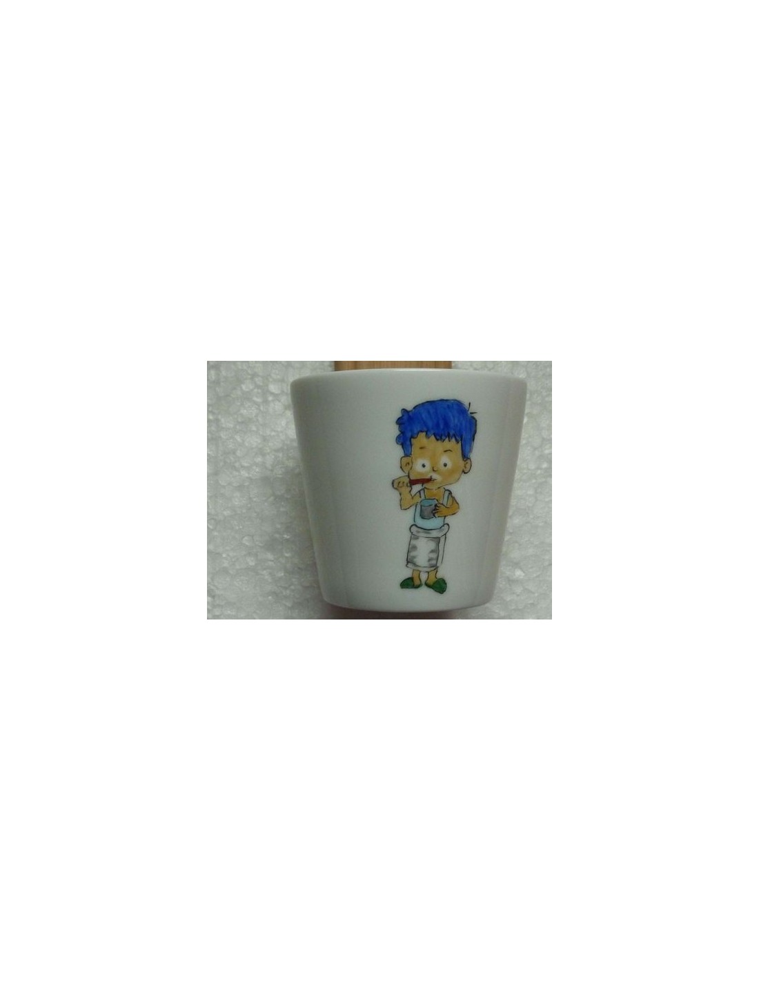 Ce verre" Le petit garçon" invite l'enfant à se laver les dents, puis à déposer sa brosse sur le côté ! Verre hauteur 5,5 cm, diamètre 7.5 cm Porcelaine décorée à la main, cuite à 1100°C. Les décors ainsi fixés ne craignent ni le lave-vaisselle, ni le micro-ondes