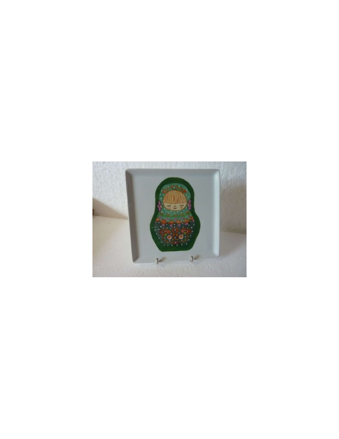Assiette carrée en porcelaine : elle peut aussi servir de vide-poche… Un motif de poupée russe verte. Vous buvez du thé ou café avec des petits gâteaux. Voici l'accessoire idéal pour votre gourmandise ! Va au lave-vaisselle, micro onde, four , congélateur ou au couteau. Dimension : 15,5 cm x 15,5 cm Modèle, unique, signé et peint à la main, porcelaine cuite à plus de 1100 ° c