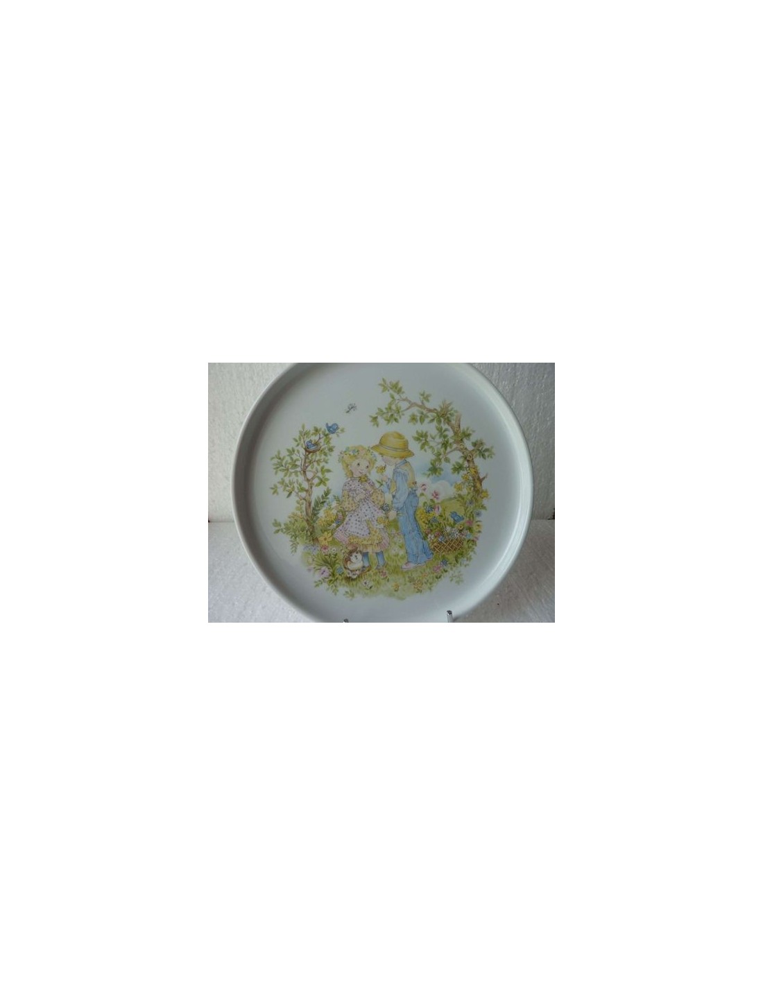 Plat de service rond , pour servir un gâteau, des mignardises, du café ou thé. Décor" les enfants et les fleurs". Pièce unique Fixation des couleurs dans un four professionnel à 1100°c Utilisation du micro-ondes et du lave-vaisselle possible