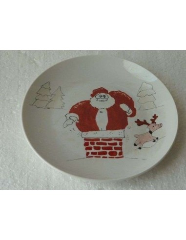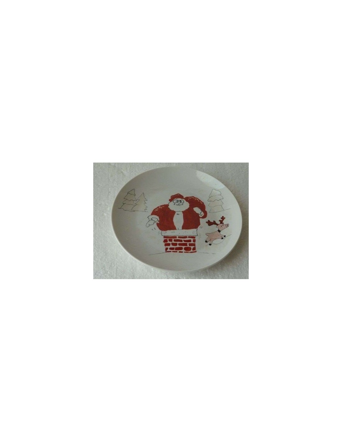 Assiette ronde, le Père Noël sort de la cheminée. Elle est compatible au four, lave-vaisselle, micro onde et couteau. Diamètre : 20 cm