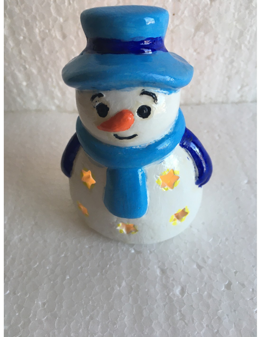 Bonhomme de neige bleu en céramique . Vêtement blanc, écharpe bleue . Avec une flamme LED .