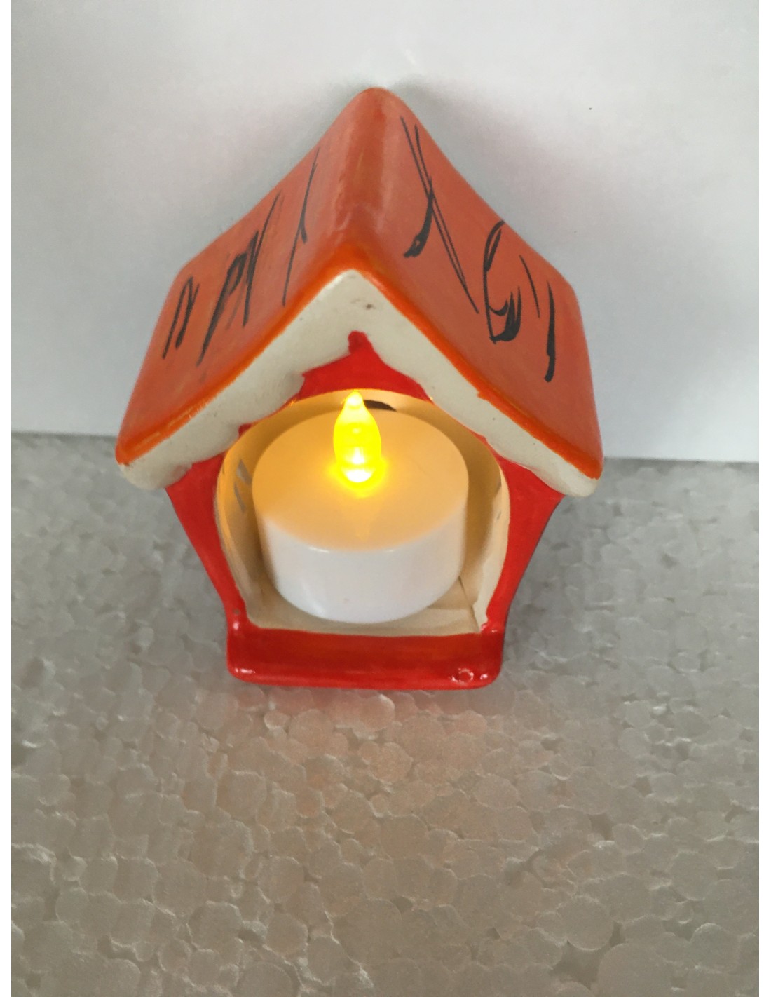 La maison de Noel en céramique .toit orange, sucre d'or rouge . Avec une flamme LED .